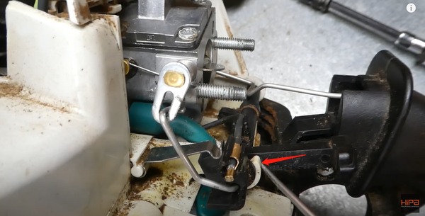 Firstly, you need to take off the cap, the air box, and the throttle lever respectively. Then you can see the weak part is the white tab where snaps the black bar.