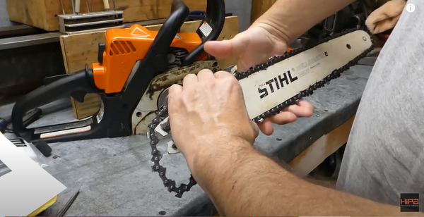 Sometimes you want to put the chain on the guide bar after you have put the bar on the saw. You may find it difficult to find enough room to put the chain up. So the easiest way is to install the chain on the guide bar first and then put it together on the saw.