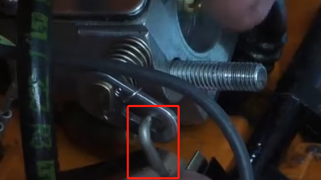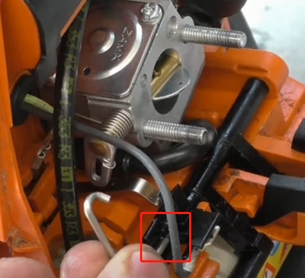 Step 7: It is time to install the choke linkage. Insert it into a small hole at the bottom of the black bar and lift up the choke mechanism to get the linkage into the cab.