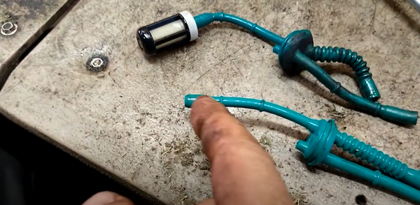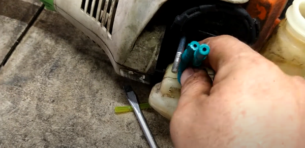 Step 6: Slide the new gasket onto the mounting posts and attach the new fuel lines to the appropriate carburetor ports. Keep in mind that when you pull the line attached to the fuel tank off, make sure that your fuel cap is off.