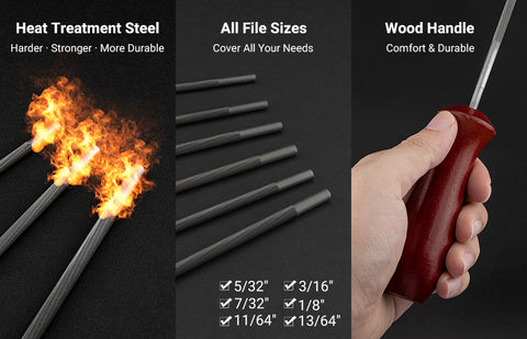 There are two common file types: round file and flat file. The round file is designed to sharpen the side and the top plate of the cutting teeth, while the flat one to sharpen the depth gauge. when choosing a right round file, you should make sure the file size is matching your saw chain size, while the flat file is for common use without much limit.