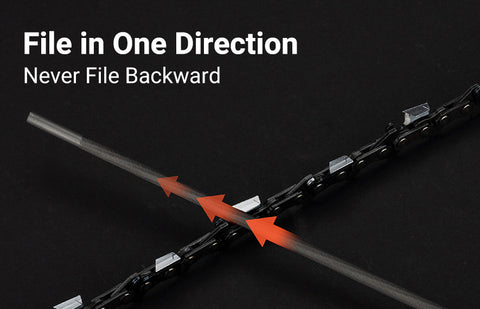 Only file the chainsaw tooth in one direction. Never bring the file back along the tooth, as filling backward is a quick way to destroy both your saw and file. The correct way of doing this is to bring the file out, reset and push the file through again.