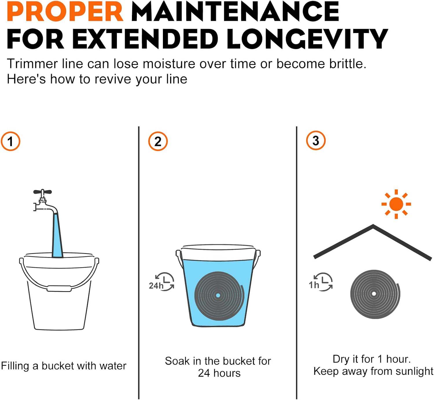 A:"Soaking trimmer line in water helps to increase its flexibility, making it less likely to break or snap during use. When the line is soaked, it absorbs moisture, which prevents it from becoming brittle, especially in hot or dry conditions. This can improve the performance of the trimmer and extend the life of the line. Soaking also reduces the chances of the line getting tangled or jamming during operation. However, it's important not to soak the line for too long, as prolonged exposure to water can weaken the material."