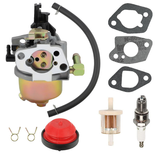 ● Package include: 1 carburetor, 3 gasket, 1 air filter + pre cleaner, 1 oil filter, 1 spark plug, 1 fuel filter, 2 fuel line with clamp (6*12mm, ID: 1/4" OD: 1/2"Bulk Hose).