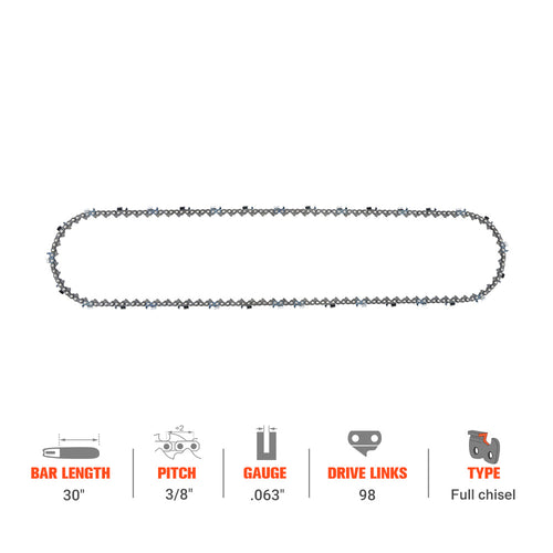 ● 3/8" Pitch, .063" Gauge, 98 Drive Links, 30 Inch Bar Length.