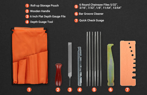 Chainsaw Sharpener File Kit - Contains every tool you need to get. the sharpening job is done. Come in a nice and durable pouch to keep everything in. The easy-to-take kit allows you to achieve optimum cutting performance. at home or in the field.